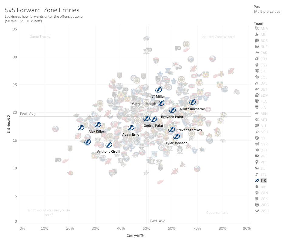 If you take a look back further into his time with the Rangers and his first year with the Lightning included, Miller was able to successfully carry the puck in at a very high rate. Tracking his last three seasons, he was able to carry the puck in 75 per cent of his zone entries, meaning a higher chance of creating something and not losing possession.