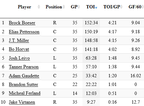 Still, there are only 15 players in the 2014 draft who have scored more goals than Jake Virtanen and one of those players was Jared McCann, drafted by the Canucks and traded by Jim Benning for Erik Gudbranson. Jake has continued to improve at his 5-on-5 scoring throughout the past few seasons and though the latest line combinations tweeted out by Thomas Drance has Virtanen back on the third line with Adam Gaudette and Antoine Roussel. The combination of Virtanen-Miller-Pettersson worked well and should be an option moving forward when the team is looking for a change.