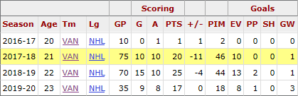 Unfortunately, there are still a few things that are holding him back. He’s still been struggling with the defensive side of things. He finds himself in the wrong position a lot of the time, he floats a lot of the time and that is likely why Travis Green has not given him a long run in the top six this season.