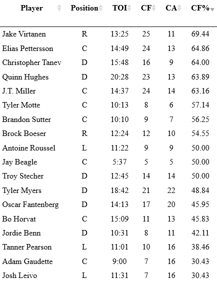 While we’re on the subject, I also want to also mention that Jake Virtanen should be given a shot at 3-on-3. The Canucks have Horvat, Miller, Boeser and Pettersson for their top four forwards that play in the 3-on-3 overtime periods. If there was to be a third group it would be a lot of fun to see Adam Gaudette and Jake Virtanen go for a spin with so much open ice.