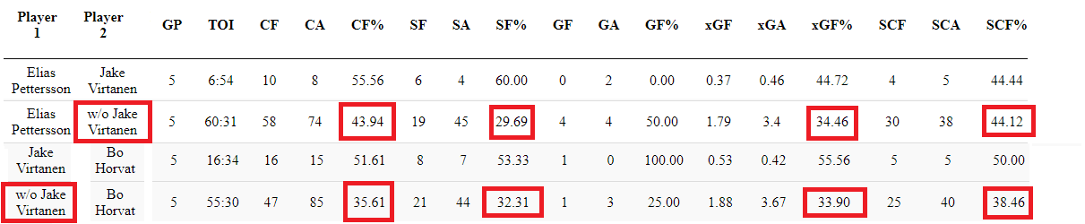 Horvat has looked good at times in the Knights series but has been quiet through games as well. His possession numbers, shot share, expected goals for percentage and control of scoring chances are much better with Virtanen on his wing.