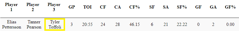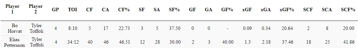 Though moving Toffoli out of the top six is not what a lot of people want to hear, I do believe it gives the Canucks their best chance of winning the 5-on-5 goal share battle. It gets the most out of the duo of Toffoli and Virtanen as both players have not performed up to their scoring potential in the current positions in the lineup that they have been in so far.