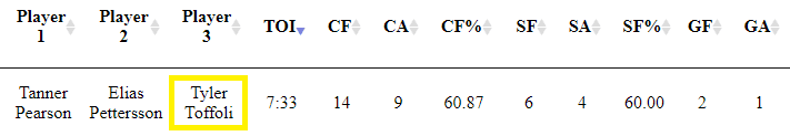 Toffoli was skating on a line with Elias Pettersson and Tanner Pearson in that game. That line looked good at the time but has not been the same since.