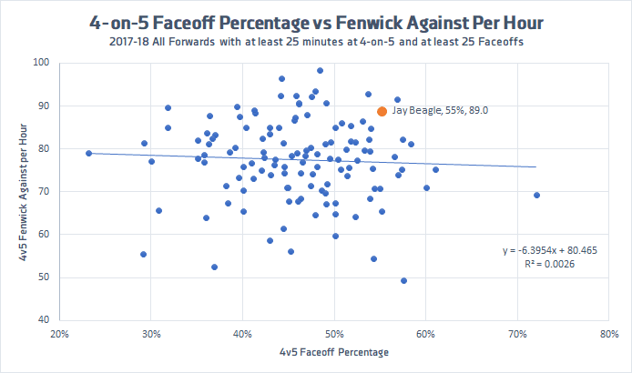 In order to assess the relationship between faceoffs and penalty kill suppression, I pitted 4-on-5 faceoff percentage against 4-on-5 unblocked shots against per hour for all players that spent at least 25 minutes at 4-on-5 last season and took at least 25 faceoffs in that situation. (Some people would prefer to look at goals against rather than a shot metric – I firmly believe this would be a mistake. For one, goals are a smaller sample than shots, which invites more volatility when considering rates; goals are also effected significantly by the quality of the goaltender, while shots given up are more indicative of the players defending on the ice. But, if it makes you feel any better, Beagle’s goals against per hour was also below average, and his expected goals against per hour was one of the worst on the Capitals last season.)