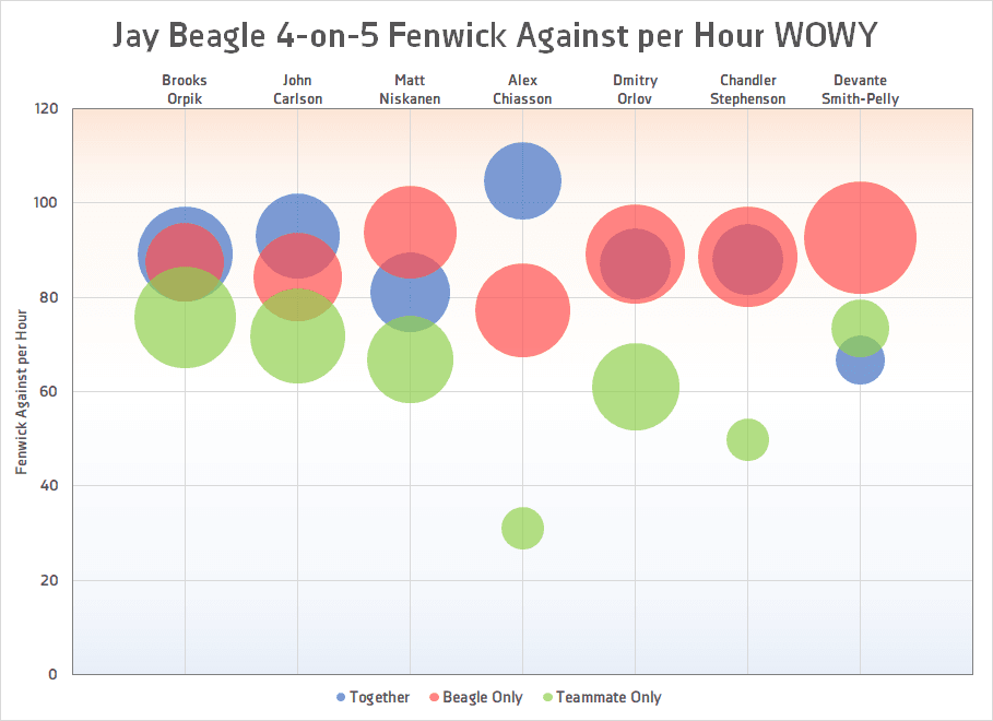 The red bubbles indicate Beagle’s rates without the above-noted teammates, while the green bubbles indicate teammates’ rates without Beagle, and the blue bubbles represent their rates together. These seven players represent all Capitals that spent at least 30 minutes with Beagle at 4-on-5 last year. In each and every case, the teammate showed reduced rates of unblocked-shots against when they weren’t on the ice with Beagle, sometimes by substantial margins.