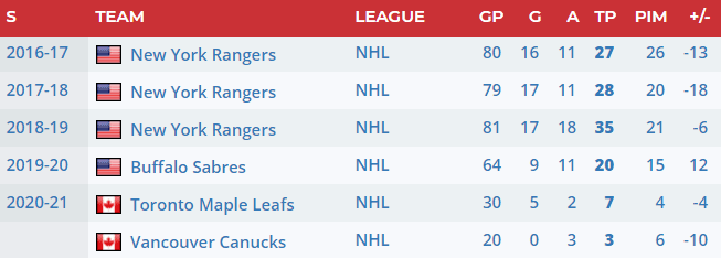 This past season, he added a bit of offence with the Leafs in a fourth-line role where he averaged just 11:07 a game. After the move to Vancouver, his offence fell off a cliff.