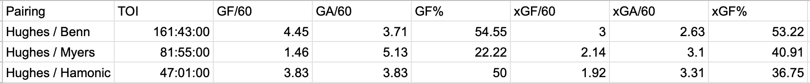 When compared to other partners that Hughes has played significant minutes with this season, it’s clear that Benn has been the best fit. It’s clear that Hughes performs best with a steady, no-nonsense defender beside him to soak up some of his defensive miscues and Benn has established himself into that role with Travis Hamonic injured.
