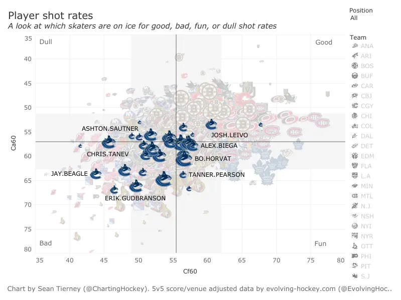 When looking at the underlying shot-based metrics, Leivo comes out looking like the Canucks’ best two-way player, but summing up his entire performance for Vancouver isn’t necessarily so straightforward.