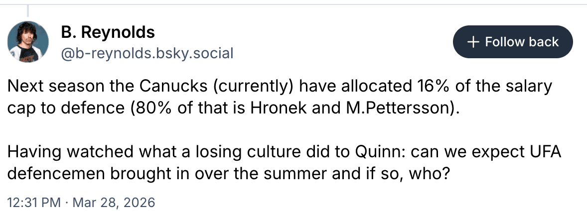 I think it’s pretty clear by now that running with four young defencemen on a nightly basis hasn’t worked for the Canucks. And people can say ‘play the kids’ but if they’re getting shelled on the regular and not showing signs of growth and development, it seems to make sense to bring in at least one veteran UFA defenceman to insulate the young guys and to support Filip Hronek and Marcus Pettersson. Attracting veteran UFAs with short-term offers to play for a last place team will likely be a difficult sales pitch.
