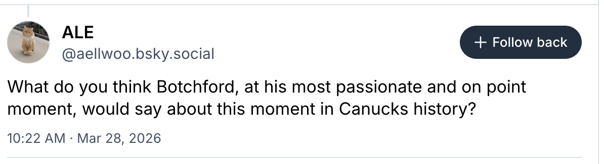 I find myself wondering this from time to time. And it’s pretty clear Botch would have had a field day covering this team. He would have been livid that this organization couldn’t support Quinn Hughes and was forced to trade the best defenceman in franchise history. It’s hard to believe, but Botch only saw Hughes play those first five games at the tail end of the 2018-19 season after he turned pro following his two years at the University of Michigan. He would still be in shock at the offensive struggles of Elias Pettersson given he watched him put up 66 points en route to his Rookie of the Year award that same season Hughes joined the fold. Botch would clearly have questioned many of the deployment decisions of Adam Foote and wouldn’t have held back letting the organization have it for its lack of centre ice depth to start the season. But more than anything, he likely would have been aghast that this team was so quickly back to – and now behind – where it was for the final few seasons he covered it. Jason Botchford wanted to cover good hockey. We all do.