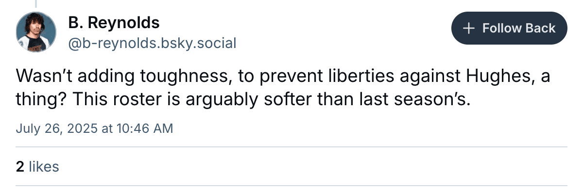 As constructed, the Canucks are not a terribly imposing team. Sure, they’ve got some size on the blueline and they have the NHL’s hits king in Kiefer Sherwood. But even with that personnel in place last season, there were still examples of teams taking liberties with Quinn Hughes. The Canucks have added Evander Kane this offseason, but that was offset by the loss of Dakota Joshua in terms of size up front.