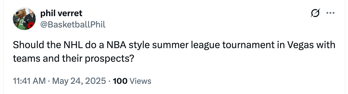 No. I wish Young Stars was still a thing and certainly hold out hope it will be again some day. It was the perfect way to showcase prospects and to launch into the new hockey season. I think teams value their summer development camps as a way to introduce prospects and draft picks to the organization and to give them a firsthand look at the way the team conducts its business on and off the ice. I see little value in a league-wide tournament for prospects.