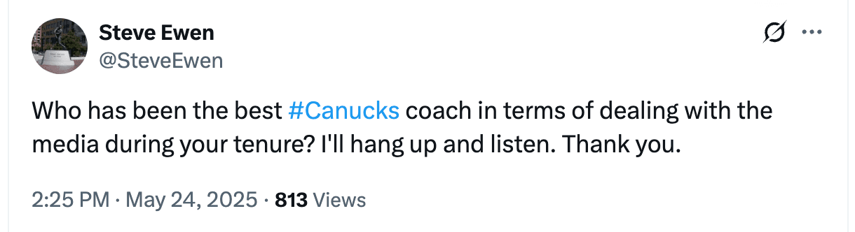 I’m going to say Alain Vigneault. Much of that is due to his longevity on the job and the fact that he found the perfect mix of honesty and humour. It helped that his teams won an awful lot so the mood at the rink was often much lighter than in the past decade. Travis Green gets high marks for putting up with me home and away for three seasons while I was covering the team at TSN 1040. Imagine having to deal with me that often? And Travis did it well. Almost all the time.