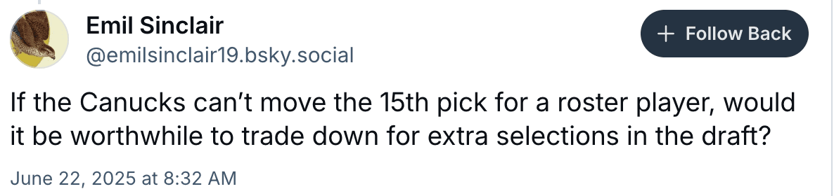 It’s certainly a strategy worth considering. I don’t think the 15th pick by itself is landing the Canucks the kind of player that addresses their pressing need for help at centre at the top of the lineup. But it could certainly be a significant part of a deal to make the club better.