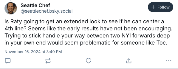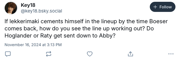 So many moving parts to this one. Let’s all hope Brock Boeser gets back soon, but it sounds like it’s been a slow recovery so far from the brutal headshot by Tanner Jeannot 10 days ago. So that likely means an extended run for Jonathan Lekkerimäki to play in Boeser’s spot at evens and on the power play. It’s clear Lekkerimäki needs to play in the top six. So when Boeser returns, it presents options for Rick Tocchet and the coaching staff. Maybe Lekkerimäki gets a look with Elias Pettersson and Jake DeBrusk. As for roster ramifications, Höglander is not going to Abbotsford. He’d need to be placed on waivers, so that’s not happening. Räty can be sent to the minors and likely would. Of course, Lekkerimäki can also be returned to the farm. My gut feeling is Lekkerimäki hasn’t seen the last of the American Hockey League just yet. He’s looked good in his first week in the NHL, although he didn’t manage a shot on goal Sunday in his first taste of back-to-back action at the NHL level. Look, it’s a numbers game and unless the 20-year-old absolutely crushes it while Boeser is out, he will likely find his way back to the Fraser Valley for a little more seasoning. And that’s not a bad thing.