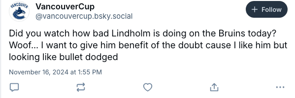 I will admit I do chart the success of former Canucks closely. Sometimes, I think I should really just let them go. But it’s easy to look at Boston and get the 2-for-1 update deal with Elias Lindholm and Nikita Zadorov. While Lindholm is third on the Bruins in scoring, that’s not saying much. Someone named Cole Koepke is fourth. Lindholm has two goals and seven assists in 19 games, averaging 18:14 of ice time. He was terrific for the Canucks in the playoffs. Let’s all remember that. But Lindholm signed a seven-year contract in Boston in the summer worth $7.75M per season. That’s a lot of money and a lot of term for a guy that turns 30 in two weeks. His offence has been in decline for a few seasons now. He can still be a valuable contributor on face-offs and on the penalty kill. But the Lindholm contract seemed like an overpayment the minute it was signed, and now on pace for 10 goals and 38 points as the Bruins near the 20-game mark, it’s probably best that the Canucks did not lock themselves into that deal.