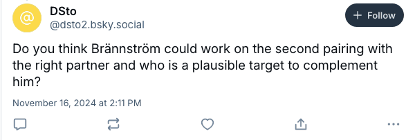 I like where Erik Brännström is slotted and what he’s brought to the third pair on the Canucks. I’m not sold on the idea of him being used in any sort of shutdown capacity. Nor do I think this coaching staff that loves its giants on defence would be into a pair of undersized puck movers holding down the top two left-side slots on the depth chart. Let’s be honest: Brännström’s goal and the open-ice hit against Chicago were terrific. And so was his ability to get his shot through traffic on the Aatu Räty goal against Nashville. However, his defending against Nick Foligno in open ice on the Hawks’ lone goal left something to be desired. So I’m in no rush to anoint him a top-four defender on this team just yet. Clearly, the second pairing has struggled mightily. But I don’t know that Brännström is the answer. Maybe it’s worth a shot given the dire circumstances above him on the depth chart. But I don’t think it’s the long-term answer. As for the second question, let’s not put the cart before the horse and worry about hypothetical partners in an elevated role at this stage.