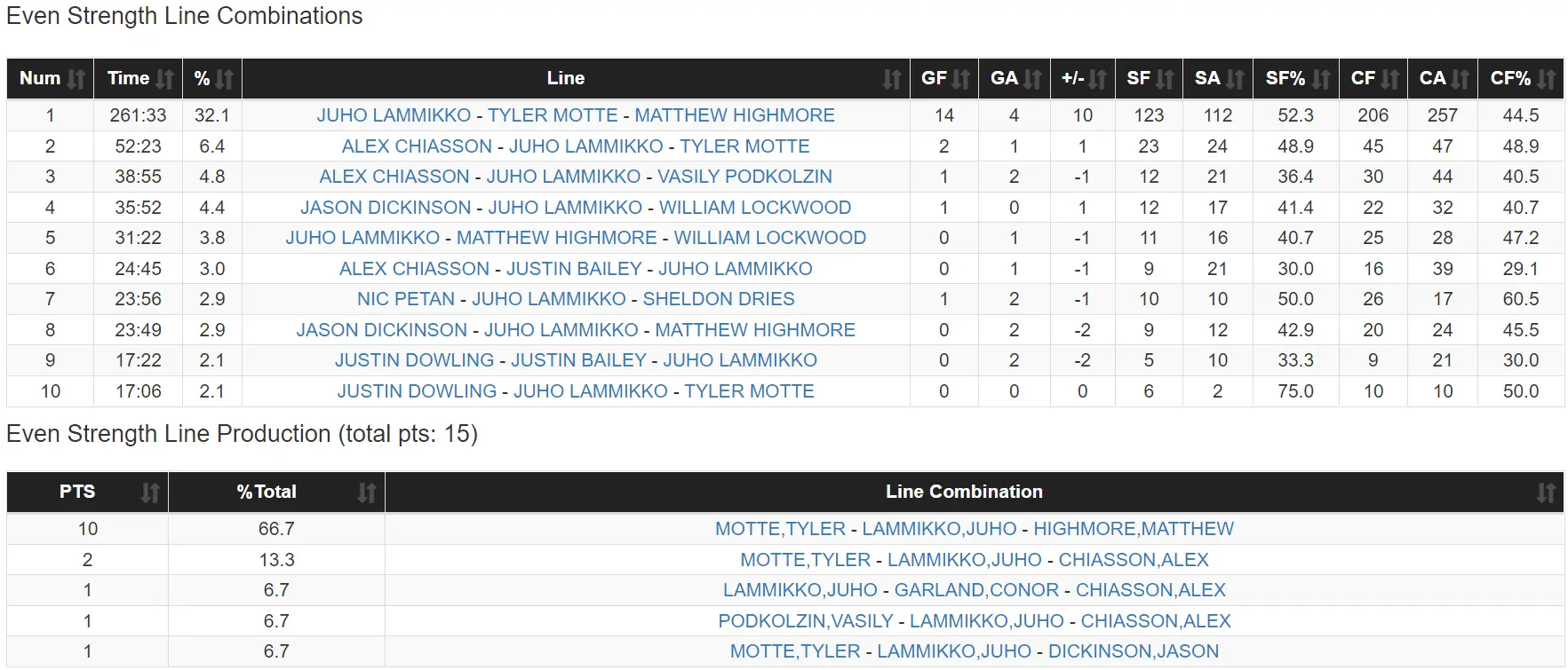 It should be noted, however, that this was not simply a case of Lammikko being briefly buoyed by superior linemates and then slipping back to his actual standard of play. The WOWY numbers, and other such measures, show that both Motte and Highmore also played their best hockey alongside Lammikko. If there was any buoying going on, it was mutual. Another word for that is “chemistry.”