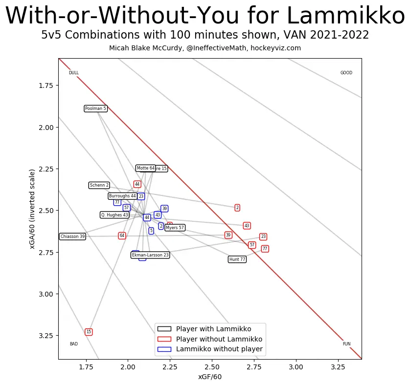 But a good chunk of that negative play came during the opening stretch of the 2021/22 season, as the entire Canucks roster was floundering under Green and as Lammikko was finding his way with a new team.
