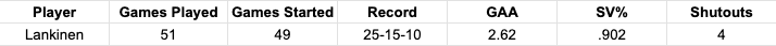Lankinen had a career year, setting career-highs in games played (by 14), games started (by 12), wins (by eight), goals against average (by 0.13), and shutouts (by two).