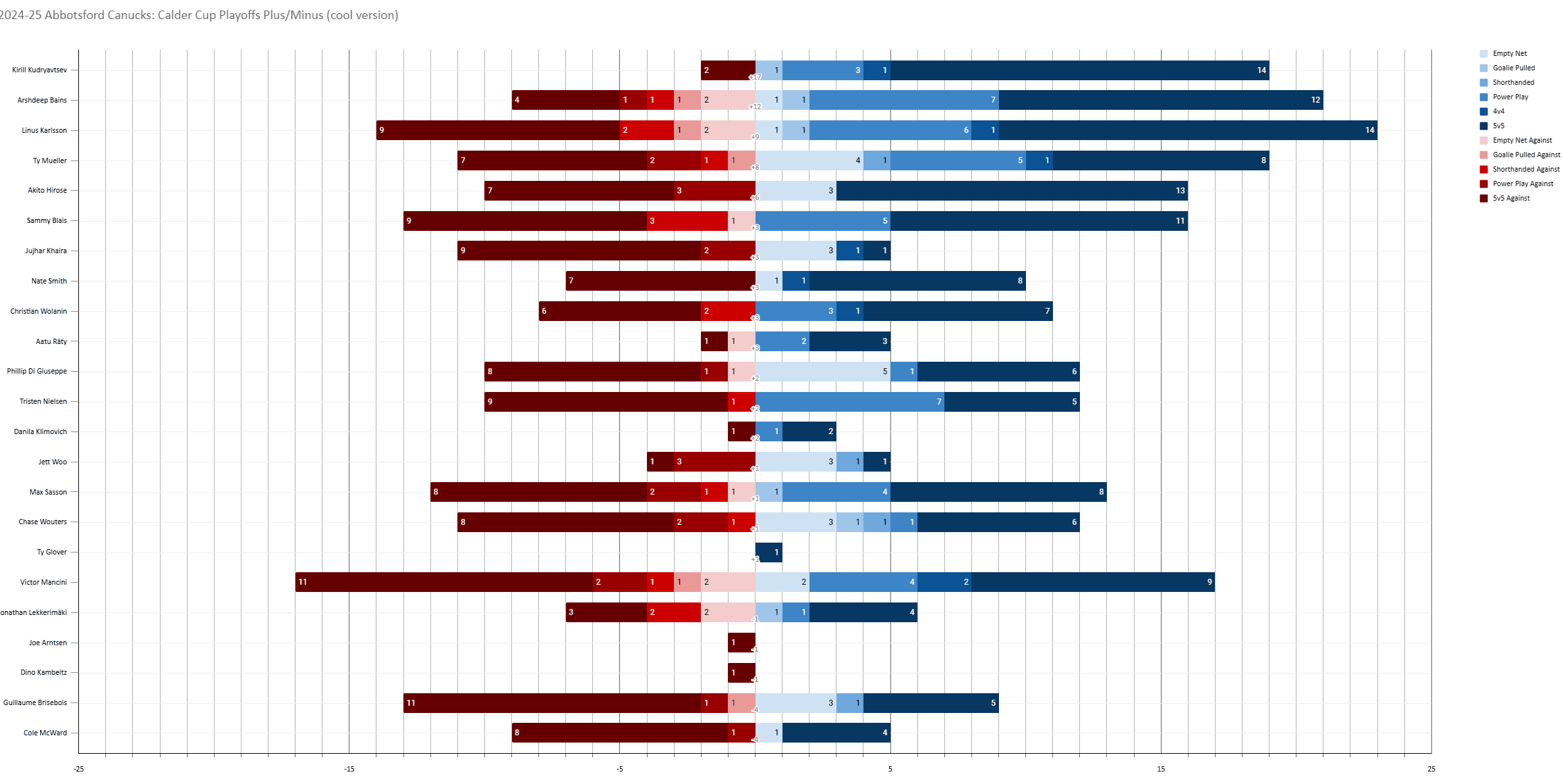 Throughout its entirety, he co-leads the entire Calder Cup playoffs with an impressive plus-13 rating, having been on the ice for just two goals against at 5v5 in 15 games.