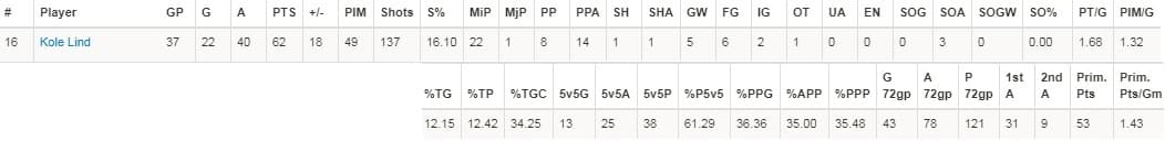 Looking at Lind’s percentage of team goals created, he leads the Rockets with 34.25%, over half of his goals come at even strength, and 63% of his assists are primary assists. One would think then that everything flows through him, but then you have to remember that Dube is also on that team as are brothers Cal and Nolan Foote. It’s an embarrassment of riches in Kelowna.