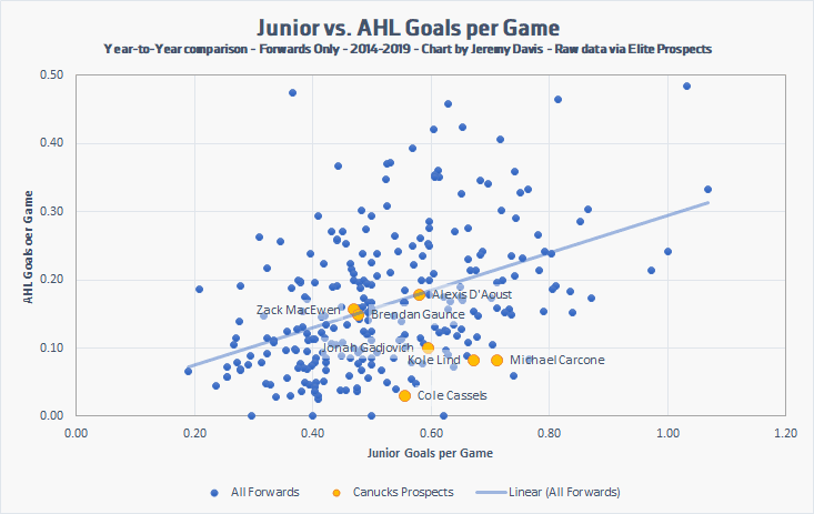 The following chart plots the goals per game rates (one year to the next) of forwards that made the jump from Canadian junior leagues to the American League between 2014 and 2019. Only forwards with 20 games played in each season were considered. A trendline slices across the plot, showing an unsurprising positive correlation between the two rates, and signifies an approximate average. Anyone above that line had a higher-than-expected junior-to-pro offensive conversion rate. Anyone below that line had a lower-than-expected conversion rate. You’ll notice that almost all of the Canucks prospects listed fall below that line, though a few players are nestled right up against it.