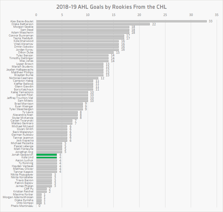 If we start looking around the league at other prospects and other organizations, we can see a wide variety conversion rates. The gold standard this season is Tampa Bay’s Alex Barre-Boulet, who scored 33 goals this year in his rookie season with the Syracuse Crunch. Ottawa’s Drake Batherson is a distant second with 22 goals for Belleville. There are more than two dozen other such forwards with more than 10 goals. In fact, altogether there are 47 CHL-to-AHL rookie forwards that have more goals than Lind and Gadjovich do.