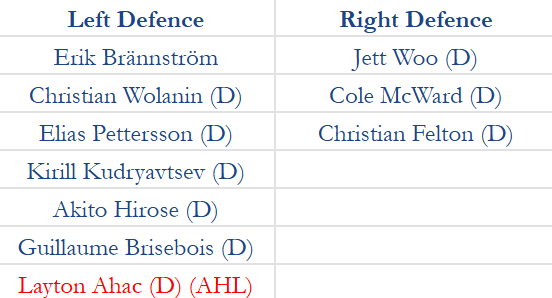 On nights when both are in the lineup, the Canucks would be icing a largely inexperienced blueline with just 65 AHL regular seasons between Cole McWard, Elias Pettersson, Christon Felton and Kirill Kudryavtsev.