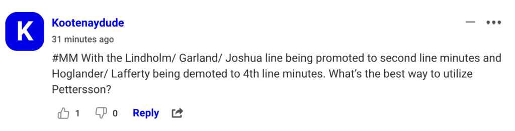 Last night, it was the Joshua-Lindholm-Garland trio’s big night, but who’s to say that it won’t be Pettersson’s night in game two when he should face lower-end competition while the Miller and Lindholm lines take the more difficult matchups?