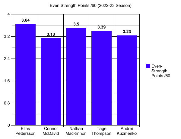 This season, Pettersson is number one for points per 60 at even strength. Topping names like Nathan MacKinnon, Connor McDavid, and David Pastrnak. An interesting note here is that Andrei Kuzmenko comes in at 11th in the NHL for even-strength points per 60.