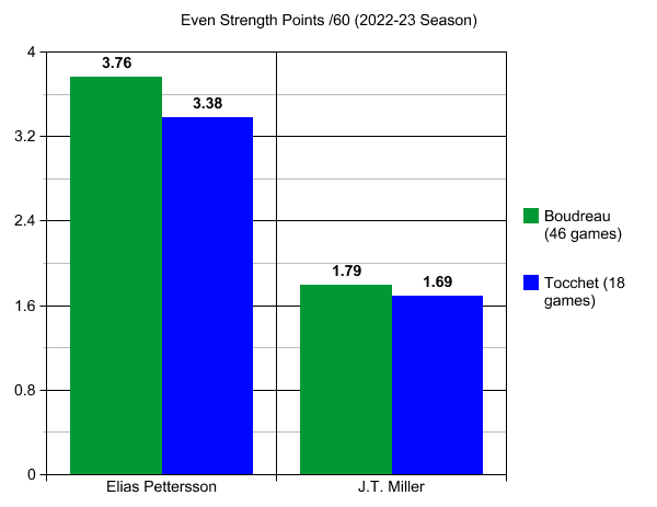 Believe it or not, even though Pettersson has been scoring at a tremendous rate under Tocchet (27 points in 18 games), he is producing noticeably less at five-on-five. Miller has also seen a drop in his five-on-five production rate, but not to as much of a significant degree as Pettersson.