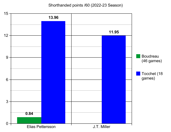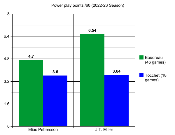 Pettersson has two goals, while Miller has one over the 18 games under Tocchet while on the man advantage.