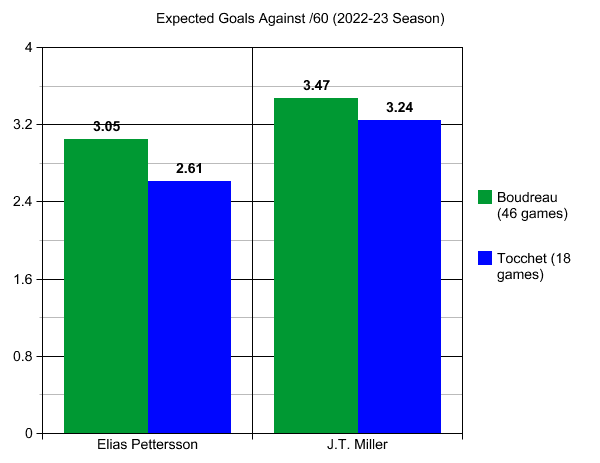 Both Pettersson and Miller have seen a drop in expected goals against per 60 under Tocchet.