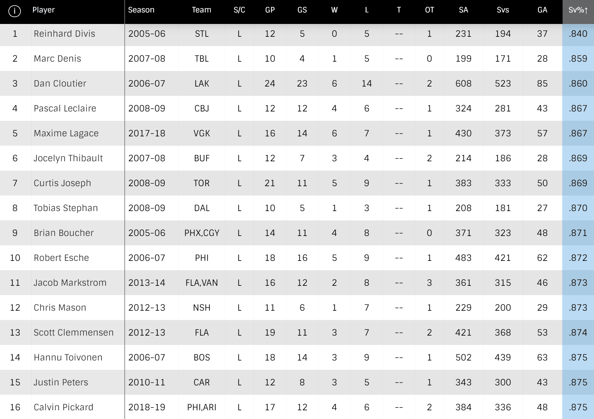 As harsh as that may sound in hindsight, those concerns were completely justified at the time. To put it simply, Markstrom had not performed like an NHL-calibre goaltender up until the Canucks traded for him in 2013-14. In fact, that season would go down as one of the worst performances by a backup goaltender in recent memory. Since 2005-06, 979 goalies have laced up for at least 10 games in a season. Among those goalies, Markstrom’s performance in 2013-14 ranks 969th. One needs only to look at the players in his cohort to get a sense of how unprecedented Markstrom’s comeback has been.