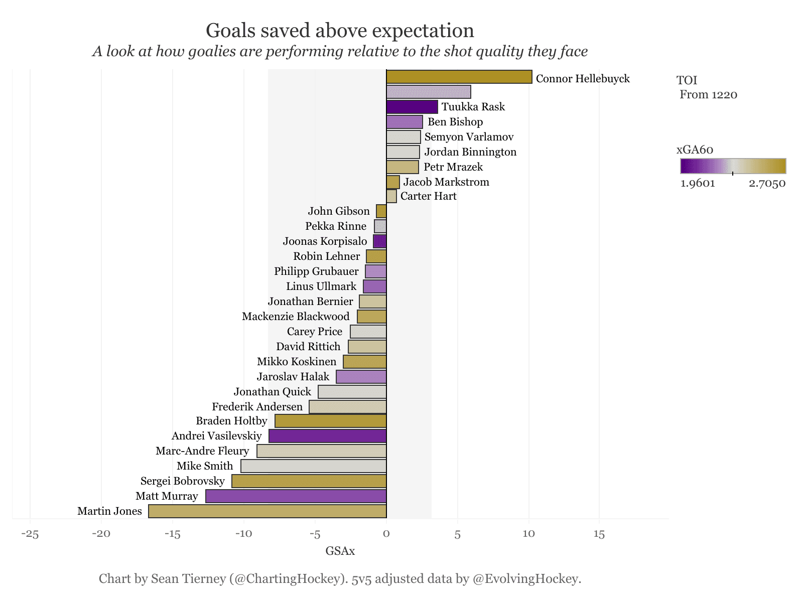 According to stats tracked by Evolving-Hockey.com, Markstrom has been significantly above average for the past two seasons. Goals Saved Above Average (GSAA) is a stat that measures how many goals a goaltender has stopped in comparison to how a league-average goalie would perform under the same circumstances. In 2018-19, Markstrom ranked 22nd among all goalies with a GSAA of 5.16, and this season, he ranks 9th overall with a GSAA of 10.03. Markstrom’s play has been especially impressive on the PK, where he also ranks 9th among all goalies with a GSAA of 2.5. He’s also fared well in terms of goals saved above expectation, which accounts for how many more goals a goalie has stopped than his team would be expected to give up based on the quality and quantity of the shots they are conceding.