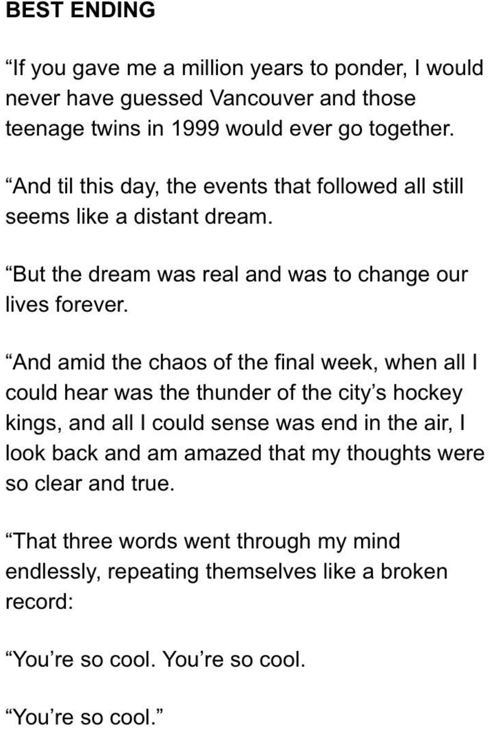 As far as his writing is concerned, I think his final two editions of the Provies, on the Sedins’ final home and road games, are some of the finest pieces of sports writing this city has ever seen. When I initially got the news of Jason’s passing, I immediately thought of this passage, from his final Provies: