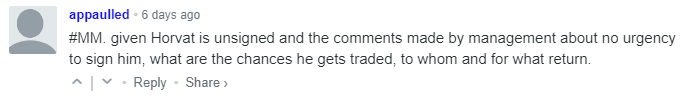Horvat has a lot of value on the trade market. He is 27 years old, scored 30 goals last year, and has played against tough competition with weak linemates for most of his career. He certainly helps the team’s depth at centre and gives the group a good one-two-three punch down the middle.