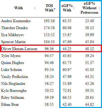 Pettersson has played more than 20 five-on-five minutes with 11 different players this season. He has improved 10 of those 11 players’ expected control of goals scored. The only player who doesn’t see improvement when playing with Pettersson is Oliver Ekman-Larsson.