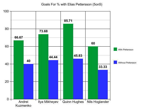When it comes to control of goal share, Pettersson has been the man who has carried not only his linemates, but also Quinn Hughes and Nils Hoglander at controlling the goal share at five-on-five.