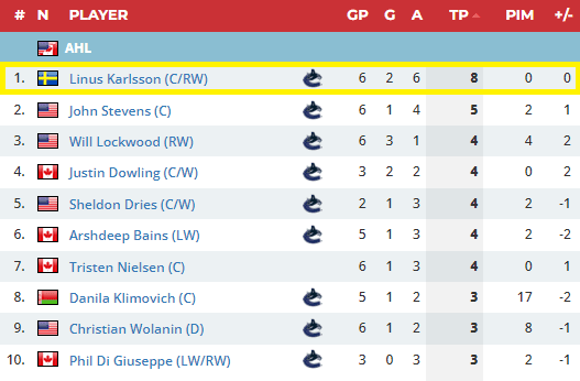Karlsson has been the most productive player in Abbotsford up to this point in the season and it’s not just power play points, as some may have expected. Karlsson is creating offence at even strength and looking more than solid in his own zone with and without the puck on his stick.
