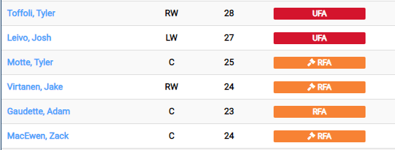 Tyler Toffoli should be back on a contract that is three or four years at 4.75-5.25 million dollar AAV.