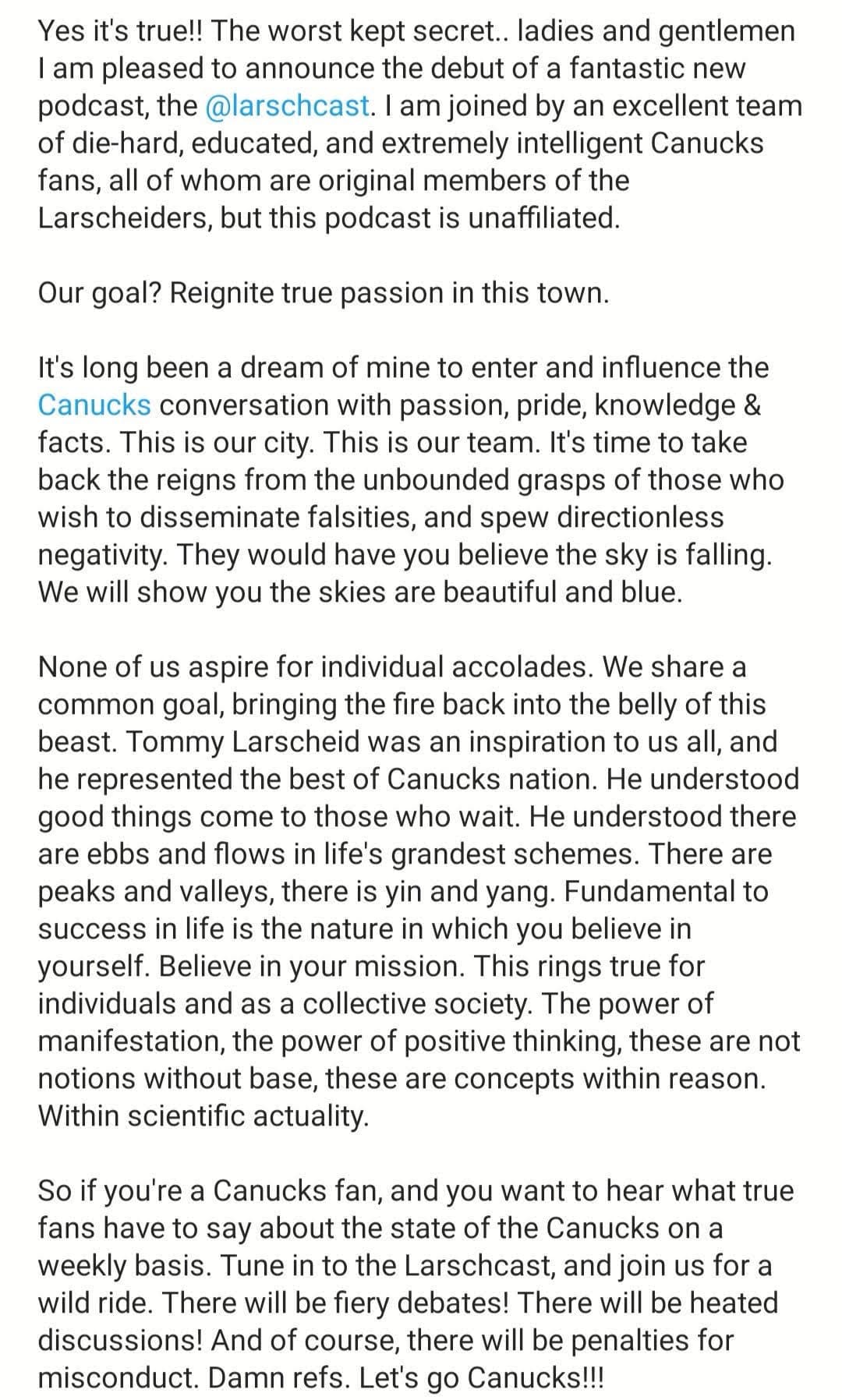 Tej Dhaliwal debuted the Larschcast, a podcast by and for what Jason Botchford might have called the “anti-negs” when he was still among us. They popped on the scene a couple months ago with this novel of a mission statement and their consistent anti-negativity, anti-media stance.
