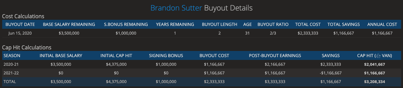 However, buying out Brandon Sutter’s contract would give the Canucks a little more than $2 million in savings for the 2020-21 season. This is what I see the team doing once the buyout period opens.