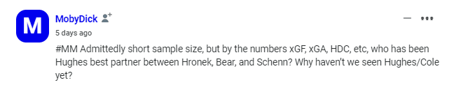 As for why we haven’t seen Hughes with Ian Cole, I guess it’s because they’ve loaded up the top pairing with Hronek and seem to have a lot of success with that pairing so far.