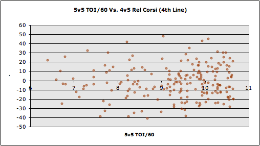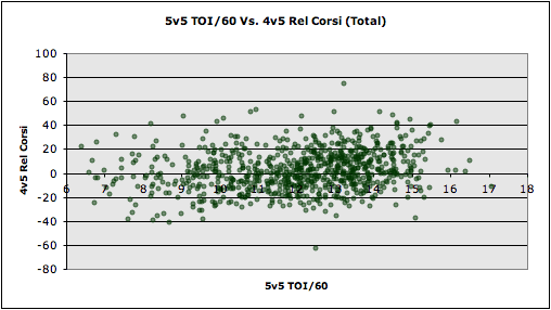 The only remaining thing to do is do it again, this time using three years’ worth of data instead of one, and focusing on a relationship between 5v5 playing time per 60 minutes and 4v5 Rel Corsi, instead of GA/60. Once again, I’ve put a minimum of 20 games played in any given season.