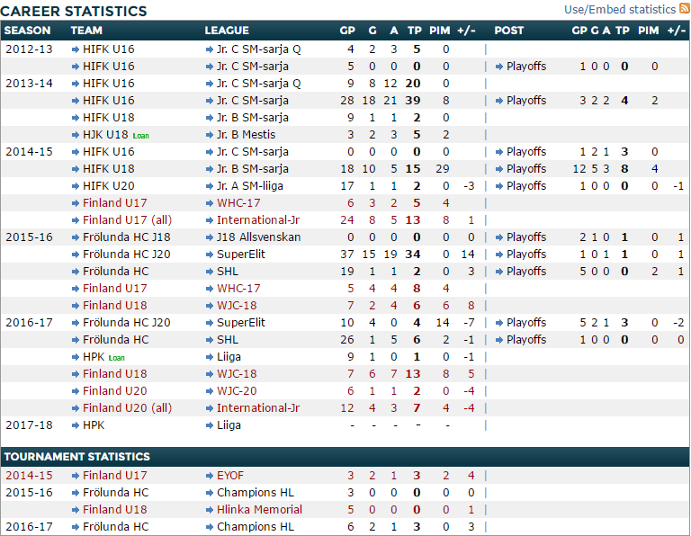 - Accomplishments/Awards: U18 WJC Silver Medal, U18 WJC MVP, U18 WJC All-Star (16/17); U18 WJC Gold Medal, SHL Champion, J18 SM Gold Medal (15/16); EYOF Bronze Medal (14/15); Jr. C Sarja Bronze Medal (12/13)