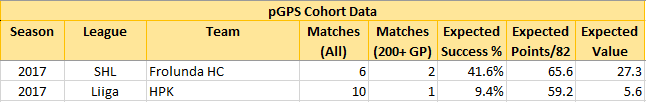Because Vesalainen played more than a handful of games in a couple of leagues, I’ve included the results of both the SHL and Liiga cohorts here. His one point in nine games in the Finnish Liiga didn’t net him a particularly high likelihood of success (though his single match with 200+ NHL GP was the very successful Mikko Koivu), but his SHL cohort certainly did, despite a points per game of 0.23 that some have portrayed as lackluster or disappointing. Magnus Paajarvi and Henrik Sedin are included in Vesalainen’s Swedish cohort – although Henrik was in his draft-minus-one season at the time, they’re really only a few months apart in age relative to the start of the relevant seasons.