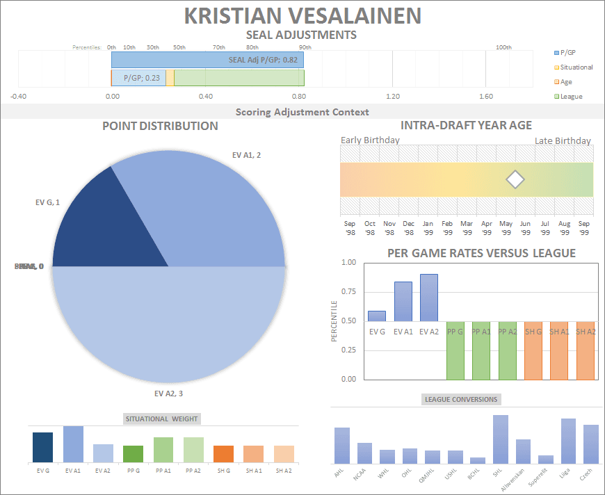 Vesalainen’s point rate got a predictably large boost, given that he played professional hockey. Age adjustments in pro leagues are significantly smaller and he did receive a little boost for some decent even strength production. His SEAL adjusted scoring rate sits in about the 90th percentile for eligible forwards in this draft (now denoted on the horizontal bar graph at the top of the chart).