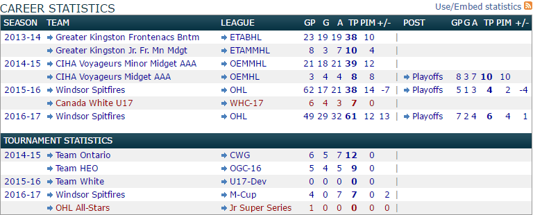 - Accomplishments/Awards: CHL Memorial Cup Champion, CHL Memorial Cup All-Star Team (16/17); OHL Second All-Rookie Team, U17 WHC Gold Medal (15/16); HEO Player of the Year (14/15)